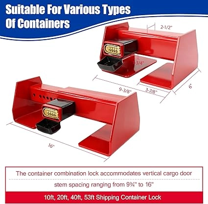 - Versatile Compatibility: This shipping container lock features an adjustable design accommodating vertical cargo door stem spacing from 9¾” to 16″. It is suitable for shipping containers, trucks, semi-trailers, and recreational vehicles.